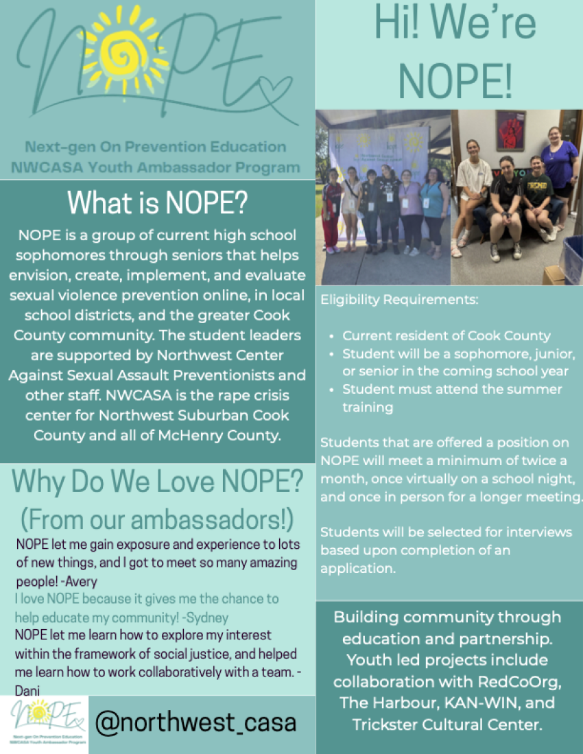 NOPE is our teen ambassador program! Cook County high schoolers have the opportunity to meet like minded teens and engage in meaningful community building while learning, growing, and supporting the NWCASA mission! Mandatory summer training and a one year commitment are required.